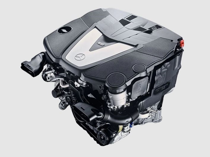 Figure 1: OM642 3.0L V6 turbo-diesel engine — top-down view showing V-bank valley, turbo, and intake manifold